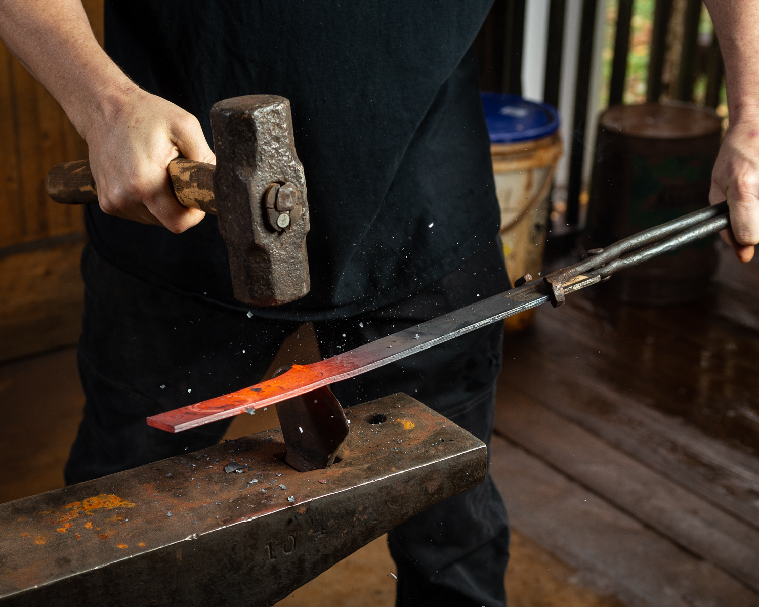 Once the steel reaches forging temperature, Meligan uses a power hammer and a hand hammer on the anvil to rough shape and hammer out the blade. That could take several hours to days depending on type of blade he is making and what type of steel he is using.