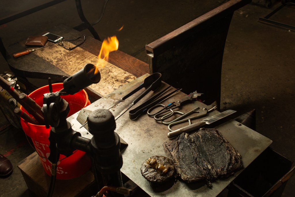 1. The first step for Meligan is selecting his steel—usually high carbon steel. He then heats the steel in a gas burning forge which reaches temperatures over 2,000 degrees—hot enough to melt steel. Meligan reads the colors of the steel to determine its temperature. He wants the steel hot enough that it won’t cause micro cracks while hammering but not so hot that all the carbon is burning out, and he doesn’t want to melt the steel.