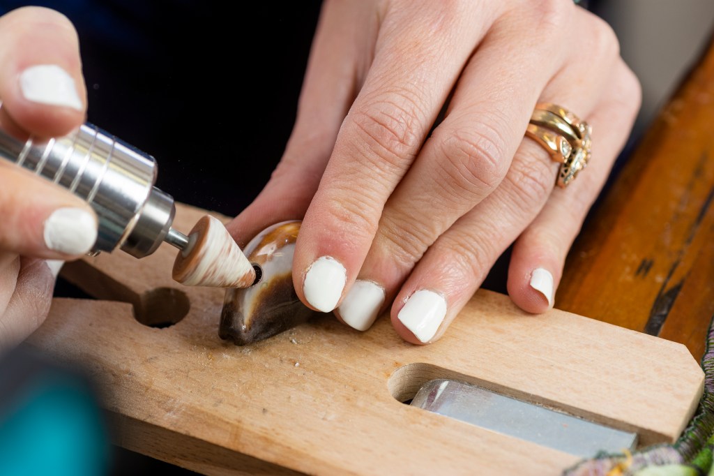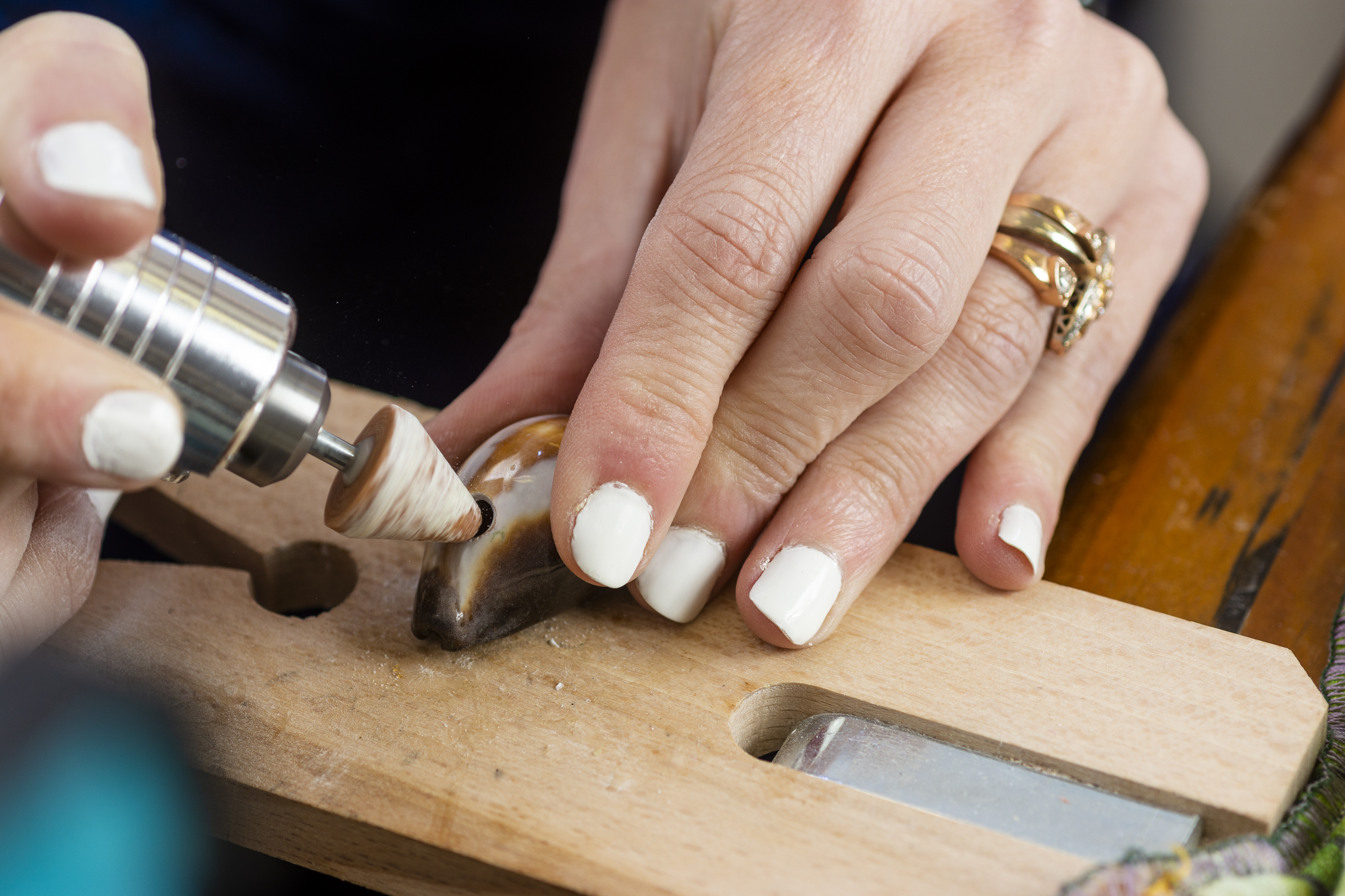 2. Next, she drills the shell noting that drilling each shell is different depending on hardness, shape and size. Duease looks at the shell, considering ring placement and any unique shapes before deciding where to drill the hole. She uses a pointed-tip grinding tool to begin the hole. The drilling must be done slowly to avoid any cracking, as the shells can be glass-like in terms of breaking into shards. As she drills, Duease gives the shell cold-water baths to keep it cool and to keep it from overheating and shattering. Once the hole is drilled, Duease uses a rounded grinding tool to round out and smooth the opening and the edges.