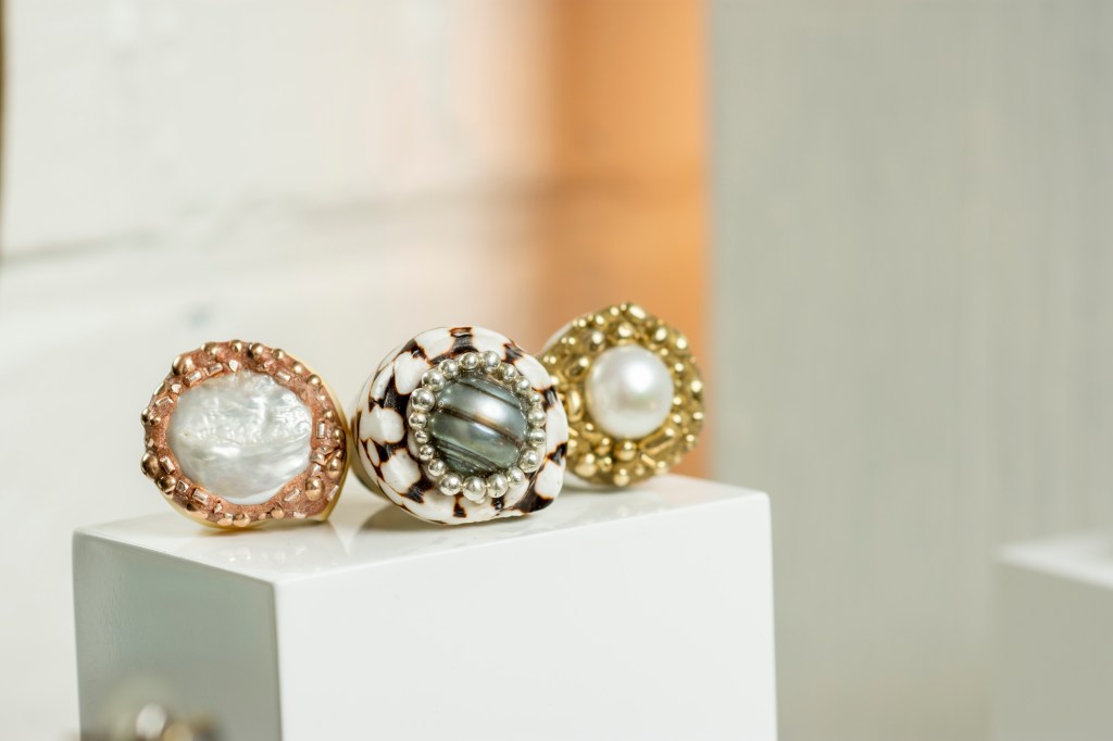 “This industry and fashion in general can be so wasteful,” she explained. “There is just so much excess, so I’m always trying to reuse anything and everything. Even if I bust a shell open or I crack a pearl, I’ll find a way to reuse it. I might set a stone inside the pearl or something like that.”