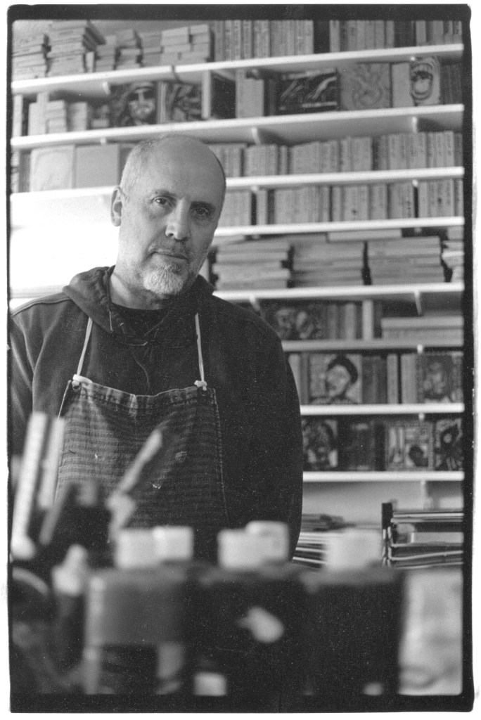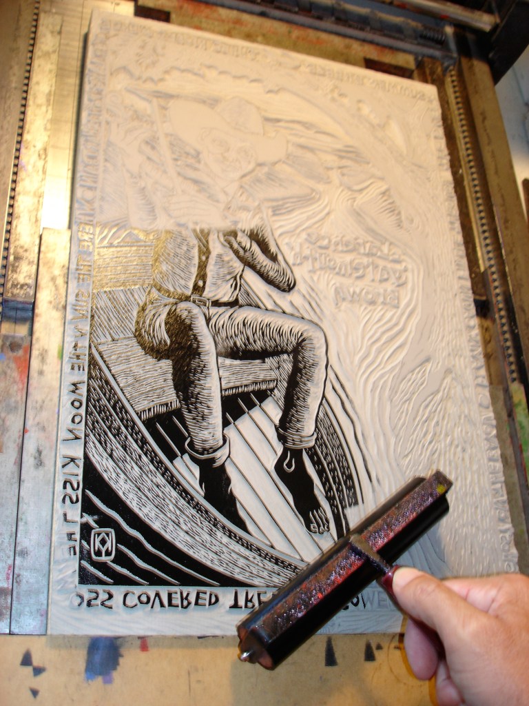 2. Once the block is carved to Yingst’s liking, the surface is inked with an oil-based ink, a paper is chosen and then both are hand-cranked through the press. The blocks that are too large for the press are burnished on the back using a large wooden spoon.