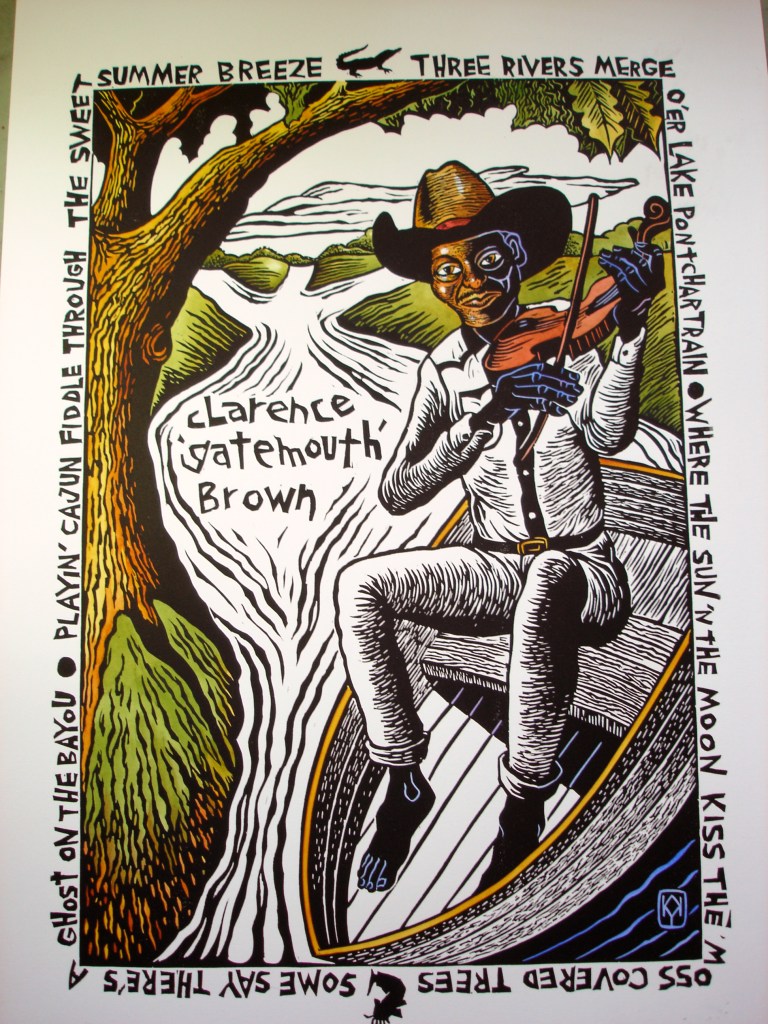 3. For multi-colored prints, an individual block is carved for every color. The print must align with the previous image and be pulled through the press multiple times. For some pieces, like the Clarence “Gatemouth” Brown print pictured here, the prints are individually painted using watercolors after printing. Prints are made in a limited edition series and the finished pieces are signed and numbered.